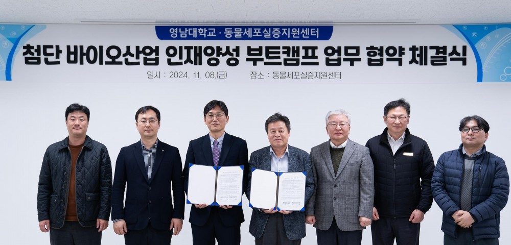 영남대 첨단바이오산업인재양성부트캠프사업단(이하 바이오부트캠프사업단)은 지난 8일 경북 안동에 위치한 동물세포실증지원센터에서 영남대 바이오부트캠프사업단 김지회 단장, 동물세포실증지원센터 이홍균 센터장을 비롯한 양 기관 관계자들이 참석한 가운데 업무협약을 체결했다.